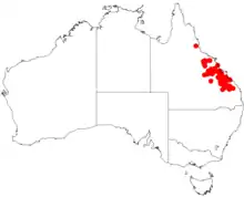 It is endemic along the east coast of central Queensland where it is found from around Eidsvold in the south to around Clermont in the north with another disjunct population neat Mount Garnett furthern north where it is a part of Eucalyptus woodland communities.[1] It is often situated in hilly areas or undulating plains in the eastern part of the brigalow belt where it grows in skeletal sandy to clay soils with poor fertility where it is a part of open forest.[3]