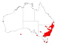 It is found in southwestern parts of Queensland, western New South Wales and Victoria on the tablelands of the Great Dividing Range. It is often a part of open woodland or dry sclerophyll forest communities and grows on rocky hilltops and slopes in rocky soils[2] an in alluvial soils along rivers and creeks. The bulk of the population is found between the Black Range in northeast Victoria in the south up to near Stanthorpe in south-eastern Queensland.[4]