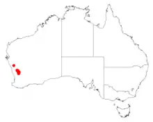 It is native to an area in the Wheatbelt and Mid West regions of Western Australia where it is found growing in yellow coloured sandy or loamy soils.[1] The range of the plant extends from around Ballidu in the south to around Latham in the north where it is usually found as a part of Eucalyptus woodland or open heath communities.[2]
