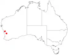 It is native to a small area in the Wheatbelt region of Western Australia where it is commonly situated on hillslopes growing in gravelly lateritic soils.[2] It has a very limited range in the Wongan Hills area where it is thought to be an opportunist in disturbed areas that is long living. It is usually found as a part of Mallee and Acacia shrubland communities that is often found with Allocasuarina campestris, Petrophile shuttleworthiana, Eucalyptus longicornis, Acacia acanthoclada, Acacia lasiocarpa and Acacia pulchella.[1] In 2006 there was an estimated 10,400 mature individual plants situated within fifteen separate populations found over an area of approximately 60 km2 (23 sq mi).[4]