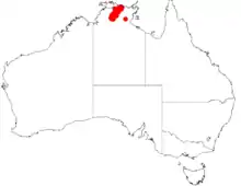 The species has a limited range within western Arnhem Land and within the boundaries of Kakadu and Katherine Gorge National Parks between Oenpelli and Edith Falls in the Northern Territory where it is found on escarpments and along creek lines growing in clay or sandy soils as a part of woodland or scrubland communities composed of species of Eucalyptus, Melaleuca and Triodia.[1]
