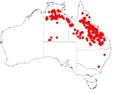 The tree is found in temperate and semi-arid parts of north eastern Australia in the state Queensland and the Northern Territory and covers an area of around 1,400,000 square kilometres (540,543 sq mi).[1] In Queensland it is found to the north and east from around Toowoomba and eastwards into the Northern Territory to around the Victoria River.[4] It is often part of monsoon forest or dry scrubland but is not a part of rainforest communities.[5] It is also found in low open forests or mixed savannah woodlands and can form dense stands.[4]