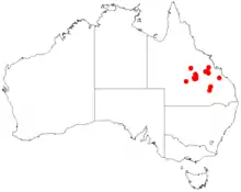 It is found in a small area of the central coast of Queensland mostly from a couple of localities around Emerald where it is situated in red soils often present as dense stands as a part of woodland communities where it is often associated with species of Eucalyptus[2] and other species of Acacia. The tree is usually found among rocky sandstone ridges and on hills in sandy to loamy soils at altitudes of 400 to 600 m (1,300 to 2,000 ft) over an area of around approximately 205,000 km2 (79,000 sq mi) from north of Aramac to about Roma in the south.[1]