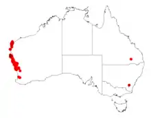 It is native to an area in the Mid West, Wheatbelt and Gascoyne regions of Western Australia where it is commonly situated on sandplains and around areas of coastal limestone growing in sandy soils.[2] The range of the plant extends from around Cape Range National Park in the north south along the coast through Kalbarri and Jurien where it is far more common. It is found as far as Mullewa and Piawaning in the east and is usually a part of coastal heath, low woodland and shrubland communities.[3]