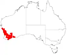 It is native to an area in the Mid West, Wheatbelt and Goldfields-Esperance regions of Western Australia where it is often situated on undulating plains and lateritic rises where it grows in sandy, sandy-clay and loamy soils.[1] The bulk of the population is found from around Port Gregory in the north west down to around the Stirling Range in the south and out to around Scaddan in the east.[2]