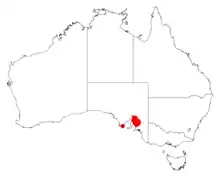 It is endemic only in a small area where it has a patchy and sparse distribution[1] in South Australia from northern parts of the Mount Lofty Range from around Burra to Auburn in the north to around the southern parts of the Tothill Ranges in the south where it is found as a part of open Eucalyptus woodland and mallee communities.[2] A population is also known at the southern tip of the Eyre Peninsula which is thought to be a naturalised population. The total area of occurrence is thought to be around 1,800 km2 (690 sq mi) It is found on grows on rocky hills, along creeklines and on roadsides growing in duplex soils with loamy soils above red clay that are usually alkaline and well-drained.[1]