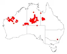 It is found in arid parts of central Australia in Western Australia, the Northern Territory and Queensland. In Western Australia it is found in the Pilbara and northern Goldfields regions where it is usually found along creeks and on rocky hills and gullies growing in stony or sandy soils often around ironstone.[5] It has a disjunct distribution form the Hamersley Range in the Pilabara where it is quite common extending east and becoming scattered from east of the Rawlinson Range in Western Australia. It is then found in the Macdonnell Ranges and Musgrave Ranges in the Northern Territory and then further east to around Dajarra in Queensland.[1]