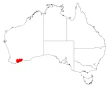 It is native to an area in the Great Southern and Goldfields-Esperance regions of Western Australia where it is commonly situated in granite river or creek beds and on spongolite breakaways growing in shallow rocky soils.[1] he range of the plant extend from around Ongerup in the west to near Ravensthorpe in the east and south to the coast around the Beaufort Inlet and Fitzgerald River National Park often as a part of low Eucalyptus woodland communities.[2]