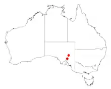 It has a disjunct distribution and is known in two areas that are situated approximately 150 km (93 mi) apart in the Flinders Range in South Australia. It is found around Brachina Gorge and Wilpena Pound in the north and around Nectar Brook on the Winninowie Range in the south. It is odften situated on rocky ridgetops as a part of mallee communities over spinifex grassland or in Callitris pine communities.[1]