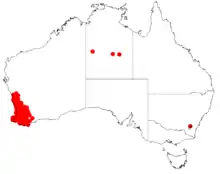 The shrub is found from the Mid West, Wheatbelt, Peel, South West and Great Southern regions of Western Australia where it is found in a variety of habitats growing in sandy soils often around laterite.[2]