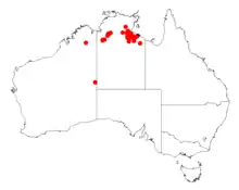 The shrub is native to the top end of the Northern Territory with the bulk of the population found from around Borroloola in the south east to the Victoria river in the south west. It is often situated on sandstone or quartzite ridges growing in skeletal sandy loam soils as a part of Eucalyptus woodland communities and is found with a spinifex understorey.[1]