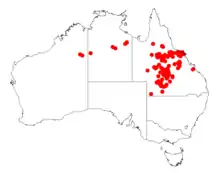 It is native to an area of far eastern Northern Territory and central and southern Queensland with a disjunct distribution extending from around Cresswell on the Barkly Tableland of the Northern Territory in the west and into Queensland mostly to the western side of the Great Dividing Range with a range extending from Einasleigh in the north down to Cunnamulla in the south and out to around Bowen in the north east. It is found growing in heavy soils, including saline clay soils and as a part of open tall woodland or low woodland and shrubland communities.[2]