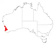 It has a discontinuous distribution from around Lesueur National Park in the north down to around Donnybrook in the south.[2] It is usually found growing in sandy to sandy-clay soils over granite or laterite.[1]