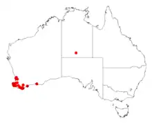 It has a discontinuous distribution and is found as far north as Perth and south through the Peel, South West and Great Southern regions as far south as Albany and east as Tambellup. It is found in swampy areas, along creeklines and on rocky hillsides where it grows in damp sandy or loamy soils and in gravelly lateritic soils.[1] The shrub is often part of the understorey of Paperbark or Jarrah woodland communities but can be found in regenerating heath land communities.[2]