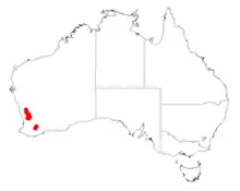 It is native to an area in the Wheatbelt region of Western Australia where it is commonly situated in swampy areas, around salt lakes and on flats growing in sandy or clay-loam soils.[1] The range of the species extends from around Marchagee in the north west down to the Mortlock River near Goomalling in the south east.[2]