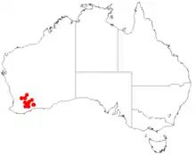It is native to an area in the Wheatbelt region of Western Australia where it is commonly situated in low-lying areas or on undulating plains growing in sandy clay or sandy-loamy soils.[1] The range of the plant extends from around Bruce Rock and Tammin in the north down to near Lake Grace in the south west and Lake King in the south east where it is often a part of open shrub mallee communities.[2]