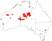 It is native to an area in the desert in the Central Ranges of the eastern Goldfields region of Western Australia growing in red sand, stony sand, loamy or clay soils.[2] The shrub is also found in north western South Australia and southern parts of the Northern Territory. The range of the species extends from as far west as Warburton in the Blackstone and Cavenagh and Blackstone Ranges to the north western margins of the Simpson Desert in the Northern Territory in the north down to around the Musgrave and Tomkinson Ranges of South Australia where it is situated along dry creeks and river beds.[1]