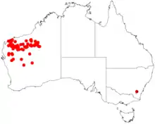 It is native to an area in the Mid West and Pilbara regions of Western Australia where it is often situated on sand plains or along creeklines and drainage lines where it is found growing in stony clay or loamy or red sandy soils.[1] The species has a scattered distribution with the bulk of the population being found from around Pannawonica in the north west to around Pingandie Station in the Asburton district in the south and out to the Great Sandy Desert in the east with several outlying populations further south. It is commonly a part of low scrub and taller shrubland communities featuring Acacia aneura and other Acacia species.[3]