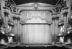 The original front stage curtain was a painted representation of draped crimson fabric with heavy golden fringe, ropes, tassels, etc. by J. R. Martin of Berlin. A secondary curtain had a scene of Lake Como, Italy, painted by Russell Smith of Philadelphia.