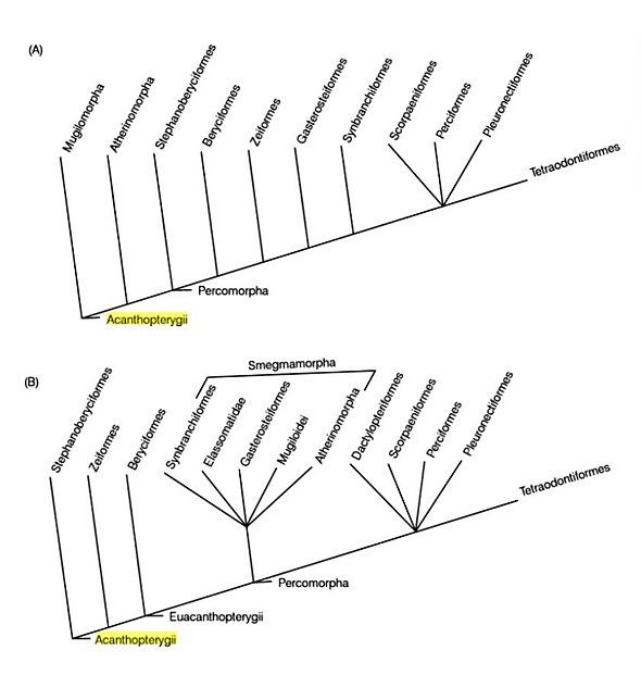 Figure 1 shows two very different hypotheses or interpretations, in the form of cladograms, of relationships among acanthopterygians, spiny-rayed fishes: Figure A from Nelson (2006) and B from Johnson and Patterson (1993B). Both agree on the major composition of the superorder Acanthopterygii, but significant differences include the placement of the mugiliform mullets and atheriniform silversides at the base of the lineage in A, whereas in B, those groups are considered higher, percomorph taxa.[1]