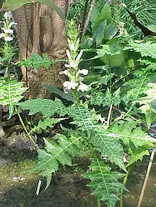 Acanthus leaves also have many medicinal uses. Acanthus ilicifolius, whose chemical composition has been heavily researched, is widely used in ethnopharmaceutical applications, including in Indian and Chinese traditional medicine.[8] Various parts of Acanthus ilicifolius have been used to treat asthma, diabetes, leprosy, hepatitis, snake bites, and rheumatoid arthritis.[9] The leaves of Acanthus ebracteatus, noted for their antioxidant properties, are used for making Thai herbal tea in Thailand and Indonesia.[10]