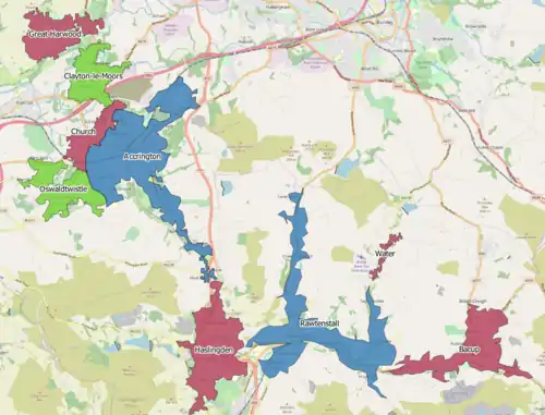 The Acrrington/Rossendale Built-up area is an urban area which extends from the town of Accrington to Rawtenstall and Bacup in Lancashire, England. The area takes in parts of the boroughs of Hyndburn and Rossendale and includes villages and towns that surround Accrington, Rawtenstall and Bacup. The area was recorded at having a population of 125,059.[1][2] The area was two separate urban areas according to the 2001 census [3] but were combined into one for the 2011 census. According to the 2001 census the Accrington urban area had a population of 71,000 whilst the Rossendale Urban Area had a population of 49,000.[3]
