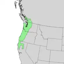 It can be found from southwest British Columbia to northern California, usually within 300 kilometres (190 miles) of the Pacific Ocean coast, found along the Columbia Gorge and Coastal Forest.[3][4] It can found no further inland than the east side of the Cascade Range.[5] It typically grows in the understory below much taller forest trees, but can sometimes be found in open ground, and occurs at altitudes from sea level up to 1,500 m (4,900 ft).[3][4]