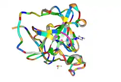 Carbonic anhydrase (ribbon) complex with a sulfonamide inhibitor (ball-and-sticks).