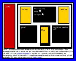 Acid1 tests many features on one page against a reference image. Acid1 was developed by Todd Fahrner, who was frustrated with the lack of stringent tests to improve browser interoperability. After looking at tests developed by Braden McDaniel that used reference renderings to clarify the intended result, Fahrner developed a comprehensive test that resulted in a quirky-looking graphic. In 1999, the test was incorporated into the CSS1 test suite.[1] The text used in Acid1 is an allusion to T. S. Eliot's poem The Hollow Men. Acid1 is included as an offline Easter egg in Internet Explorer 5 for Mac OS, accessible by typing 'about:tasman', with the text replaced by the names of the developers.[2]