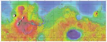 Acidalia Planitia is a plain on Mars, between the Tharsis volcanic province and Arabia Terra to the north of Valles Marineris, centered at 49.8°N 339.3°E.[1] Most of this region is found in the Mare Acidalium quadrangle, but a small part is in the Ismenius Lacus quadrangle. The plain contains the famous Cydonia region at the contact with the heavily cratered highland terrain.
