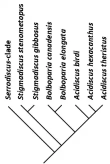 A cladogram showing the relationship between several species of the genera Acidiscus, Bolboparia and Stigmadiscus[6][7] Acidiscus is most closely related to Bolboparia and slightly more distantly to Stigmadiscus. Synapomorphies for Acidiscus-Bolboparia include anterolateral cephalic spines and a large preoccipital glabellar tubercle or spine. Both of these features have been considered as being diagnostic of Acidiscus (e.g., Rushton, 1966; Rasetti, 1966;) but they are shared with Bolboparia. Synapomorphies of Bolboparia include a sharply tapered and pointed glabella, no occipital spine, tubercles confined to posterior part of the cephalic border, strongly inflated genae, and a sculpture of tightly packed coarse granules. Stigmadiscus is characterised by an inflated posterior part of the glabella, the loss of anterolateral cephalic spines and a preoccipital glabellar node, and in having a very narrow cephalic border.
