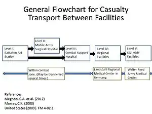 Soldiers in Iraq and Afghanistan are at risk for traumatic injury due to gunfire and improvised explosive devices. Previously, infection was thought to occur due to contamination with A. baumannii at the time of injury. Subsequent studies have shown, although A. baumannii may be infrequently isolated from the natural environment, the infection is more likely nosocomially acquired, likely due to the ability of A. baumannii to persist on artificial surfaces for extended periods, and the several facilities to which injured soldiers are exposed during the casualty-evacuation process. Injured soldiers are first taken to level-I facilities, where they are stabilized. Depending on the severity of the injury, the soldiers may then be transferred to a level-II facility, which consists of a forward surgical team, for additional stabilization. Depending on the logistics of the locality, the injured soldiers may transfer between these facilities several times before finally being taken to a major hospital within the combat zone (level III). Generally after 1–3 days, when the patients are stabilized, they are transferred by air to a regional facility (level IV) for additional treatment. For soldiers serving in Iraq or Afghanistan, this is typically Landstuhl Regional Medical Center in Germany. Finally, the injured soldiers are transferred to hospitals in their home country for rehabilitation and additional treatment.[36] This repeated exposure to many different medical environments seems to be the reason A. baumannii infections have become increasingly common. Multidrug-resistant A. baumannii is a major factor in complicating the treatment and rehabilitation of injured soldiers, and has led to additional deaths.[7][37][38]