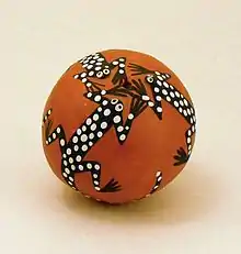 Tourism is a major source of income for the tribe.[3] In 2008, Pueblo Acoma opened the Sky City Cultural Center and Haak'u Museum at the base of the mesa, replacing the original, which was destroyed by fire in 2000. The center and museum seek to sustain and preserve Acoma culture. Films about Acoma history are shown and a café serves traditional foods. The architecture was inspired by pueblo design and indigenous architectural traditions, with wide doorways in the middle, which in traditional homes make the bringing of supplies easier. The windowpanes contain flecks of mica, a mineral which is used to create mesa windows. The complex is also fire resistant, unlike traditional pueblos, and is painted in light pinks and purples to match the landscape surrounding it. Traditional Acoma artwork is exhibited and demonstrated at the center, including ceramic chimneys crafted on the rooftop.[11] Arts and crafts also bring income.[3]