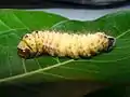 Larva apple green; paired dorsal and lateral yellow spinous tubercles on each somite except the last; dorsal yellow hairs; lateral and ventral black hairs; the pad to anal claspers rufous.