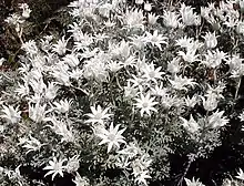 The flannel flower is generally a herbaceous shrub growing up to 50 cm (18 in) high, although rare specimens can be found to be 1.5 m (5 feet) high.[3] The stem, branches and leaves of the plant are a pale grey in colour, covered in downy hair (rather like flannel in texture). The attractively lobed leaves are up to 10 cm (4 in) long and 7 cm (3 in) wide, with daisy-shaped flowerheads around 5 or occasionally 8 cm (2–3 in) in diameter. The bracts are cream to white in colour. Flowering occurs in spring and may be profuse after bushfires.[4]