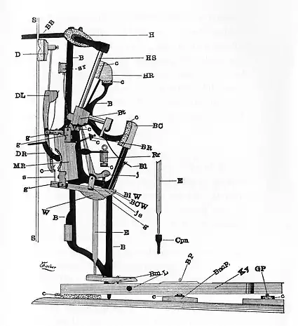 Bm, is a wooden block called the bottom; sometimes called the key-rocker. It is held in position by the two screws shown in cut by which it can be adjusted or regulated.