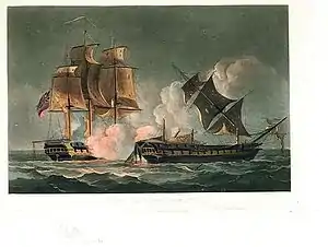 For the next hour and a half the frigates poured shot into one another at close range, until Cooke was struck by grape shot at 01:30 on 1 March, replaced by his first lieutenant Lucius Hardyman. For another hour the action continued, French fire gradually slackening until it stopped completely at 02:30, by which time only four French guns remained operational.[24] Hardyman hailed to ask whether Forte had surrendered but the French did not reply and he ordered another broadside. A second hail also brought no response but sailors were seen attempting to repair the rigging on Forte.[26] Concerned that the French were attempting to escape, Hardyman concentrated his fire on the masts of Forte, bringing them crashing down one by one until at 03:00 Forte was completely dismasted.[23][27] With all resistance ended, British merchant prisoners on board Forte emerged from below decks and hailed Sybille, requesting a boat be sent across so that British Lieutenant Nicholas Manger could formally take the surrender of the French ship.[6]