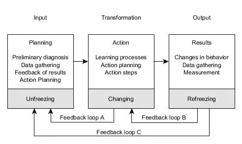 - The second stage of action research is the action, or transformation, phase. This stage includes actions relating to learning processes (perhaps in the form of role analysis) and to planning and executing behavioral changes in the client organization. As shown in Figure 1, feedback at this stage would move via Feedback Loop A and would have the effect of altering previous planning to bring the learning activities of the client system into better alignment with change objectives. Included in this stage is action-planning activity carried out jointly by the consultant and members of the client system. Following the workshop or learning sessions, these action steps are carried out on the job as part of the transformation stage.[16]