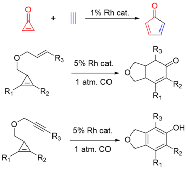 Oxidative addition into cyclopropenes normally occurs at the less hindered position to yield the metallacyclobutane. This reaction can result in formation of cyclopentadienones,[28] cyclohexenones,[29] and phenols.[29]