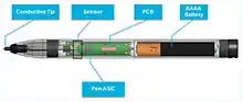 An active pen (also referred to as active stylus) is an input device that includes electronic components and allows users to write directly onto the display of a computing device such as a smartphone, tablet computer or Ultrabook.[1] The active pen marketplace has long been dominated by N-trig[2] and Wacom,[3] but newer firms Atmel[4] and Synaptics[5] also offer active pen designs.