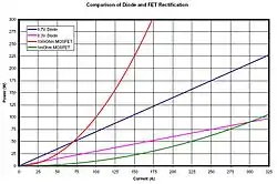 A MOSFET actively controlled to act as a rectifier—actively turned on to allow current in one direction but actively turned off to block current from flowing the other direction—is sometimes called an ideal diode. Using ideal diodes rather than a standard diodes for solar electric panel bypass, reverse-battery protection, or in a bridge rectifier reduces the amount of power dissipated in the diodes, improving efficiency and reducing the size of the circuit board and the weight of the heat sink required to deal with the power dissipation.[3][4][5][6][7][8]