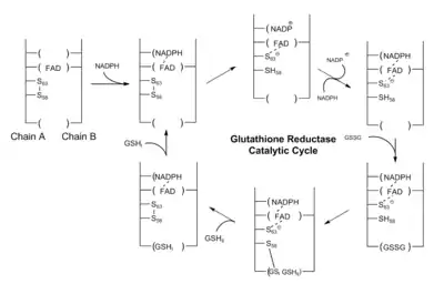 The catalytic process starts when the FAD is reduced by NADPH to accept one electron and from FADH−. It then attacks the disulphide bond formed between 2 cysteine residues, forming one SH bond and a single S− group. This S− group will act as a nucleophile to attack the disulphide bond in the oxidised glutathione(GSSG), breaking it and forming a cysteine-SG complex. The first SG− anion is released and then receives one proton from adjacent SH group and from the first glutathione monomer. Next the adjacent S− group attack disulphide bond in cysteine-SG complex and release the second SG− anion. It receives one proton in solution and forms the second glutathione monomer.
