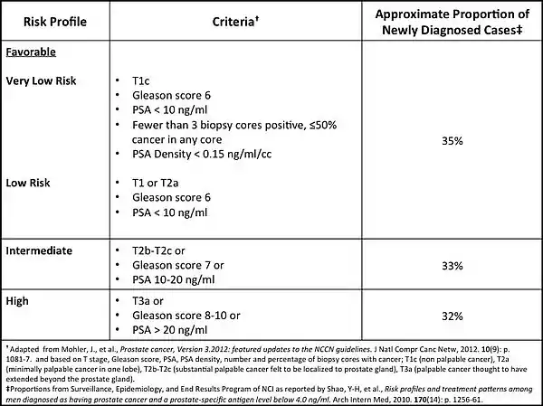 The Prostate Cancer Intervention versus Observation Trial (PIVOT) randomized 731 men diagnosed with localized prostate cancer to radical prostatectomy or observation (mean age 67 years; median PSA 7.8 ng/ml).[10] In the observation group, bone metastases and prostate cancer death occurred in 10.6% and 8.4%, respectively through 12 years.[10] Death from prostate cancer occurred in 5.7% and 17.4% of men diagnosed with Gleason score below 7 and 7 and above, respectively; and 6.2% and 12.8% of men with a PSA of 10 ng/ml or below and above 10 ng/ml, respectively.[10] Stratified by D’Amico risk groups (see Prostate Cancer Risk Stratification Table[11][12][13][14][15] at right for explanation), death from prostate cancer occurred in 2.7%, 10.8%, and 17.5% of men with low, intermediate, and high risk disease, respectively.[11] Recognizing that men in the PIVOT study were more likely to have been diagnosed as a result of PSA based testing as compared to men in the SPGS-4 who were not, it is of interest that cumulative deaths from prostate cancer in the SPGS-4 among men with low risk disease (11%) is comparable to that of men with intermediate risk disease (10.8%) in PIVOT. These data suggest that the outcomes for men with low risk disease in the pre PSA era are comparable with those of men today diagnosed with intermediate risk disease.
