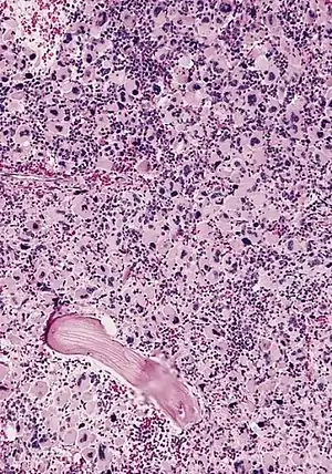 Adult-AMKL may occur in individuals who have a prior diagnosis of and/or present with chronic myelogenous leukemia, polycythemia vera, essential thrombocytosis, primary myelofibrosis, or mediastinal germ cell tumor.[1] AMKL associated with mediastinal germ cell tumors typically occurs in younger adults, i.e. ages 13–36 (average age 24).[1] Cases occurring in children aged ≤18 years, which represent ~20% of all cases, could be regarded in the non-DS-AMKL category.[20] Cases of the disease not associated with mediastinal germ cell tumors occur in adults who as a group have older median age centering around those 50–70 years old. The disorder is far more fulminant than non-DS-AMKL and DS-AMKL and generally presents with more serious hematological symptoms (e.g. anemia-related) and a much higher incidence of extramedullary manifestations (e.g. organ enlargement, leukemia cutis) than seen in the other two forms of AMKL.[1]