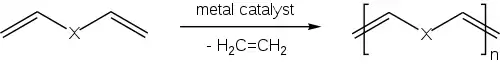 ADMET is a type of step-growth, condensation polymerization. It should be distinguished from ring-opening metathesis polymerization (ROMP), which is a chain-growth, addition polymerization.[1] Whereas ADMET is driven by the release of volatile ethylene gas, ROMP is driven by the relief of ring-strain.