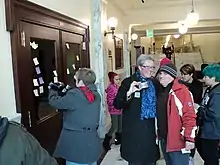 Add The Words, Idaho is an LGBTQ2A activist group and political action committee (PAC) in the United States, extant since 2010,[1] which advocates adding the words "sexual orientation" and "gender identity" to the state's human rights act;[2] this group grew out of several others which had been advocating the same. After ten years, however, Add The Words activist have been unable to achieve even one state-wide protection for LGBTQ2A Idahoans. An associated all-volunteer direct action group, Add The 4 Words Idaho, under the leadership of former state senator Nicole LeFavour, undertook a series of civil disobedience protests beginning on February 3, 2014 at the Statehouse.[3][4][5] (The PAC and the direct action group are commonly conflated as Add The Words. This article covers the series of peaceful direct actions/protests, the associated peaceful demonstrations, and the resultant printing and hearing of HB 002, which ultimately died in committee.)
