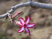Adenium multiflorum is small, succulent tree native to central and eastern Southern Africa. It may be deciduous or evergreen, and is found in dry woods or grassland in its native habitat.[1] It is typically 0.5-3 m tall.[2] Like other succulent members of the family Apocynaceae, A. multiflorum has a milky latex with toxic alkaloids, specifically Cardiac glycosides. This latex is used as an arrow poison and as a fish stunning poison.[3]