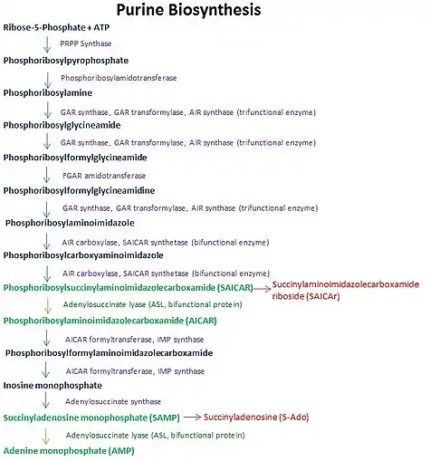 Adenylosuccinate lyase (ASL) is an enzyme that catalyzes two reactions in the de novo purine biosynthetic pathway. In both reactions it uses an E1cb elimination reaction mechanism to cleave fumarate off of the substrate. In the first reaction, ASL converts 5-aminoimidazole- (N-succinylocarboxamide) ribotide (SAICAR) to 5-aminoimidazole-4-carboxamide ribotide (AICAR) and fumarate. AICAR proceeds through three more reactions before it becomes adenylosuccinate (also called succinyladenosine monophosphate or SAMP), which ASL then splits into adenosine monophosphate (AMP) and fumarate.[8] ASL is important to cells not only because of its involvement in creating purines needed for cellular replication, but also because it helps regulate metabolic processes by controlling the levels of AMP and fumarate in the cell.[9]