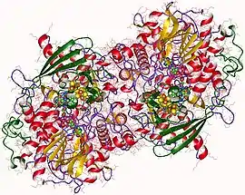 The monomer of the enzyme consists of a mix of α-helices and β-sheets (both parallel and antiparallel). The protein cofactor thioredoxin can provide the required reducing equivalents for the reaction in the form of two cysteine residues, which are ultimately oxidized to a disulfide bond.[5] The base active form of APS reductase appears to be a heterodimer, as seen in plants.[6] In both bacteria and plants, two heterodimers tend to form together and produce a heterotetramer.[7]