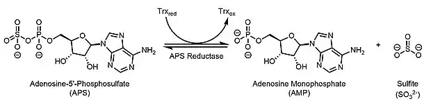 APS reductase catalyzes the reversible transformation of APS to sulfite and AMP, which is the rate determining step of the overall reaction.[2] The reaction catalyzed by APS reductase is as follows: